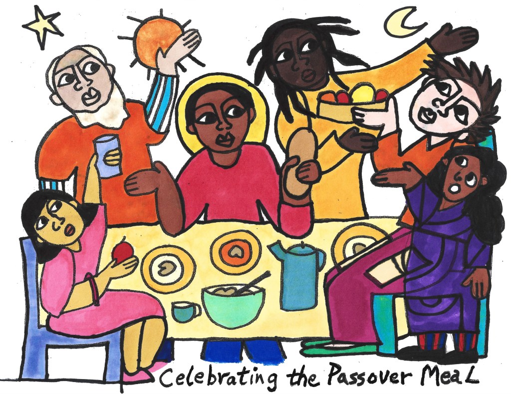 This drawing shows Jesus celebrating the Passover meal with his friends and disciples. As Jews around the world celebrate Passover (which began last night), I too want to commemorate and celebrate how God delivered God’s people out of slavery/bondage in Egypt thousands of years ago. And how later, after Jesus was put to death, God raised him up and his teachings about God’s kingdom of justice, peace, and love for all. The good news is God hears our laments and moves through history and today, working with us to free us and liberate us from oppression, injustice, war, and racism.