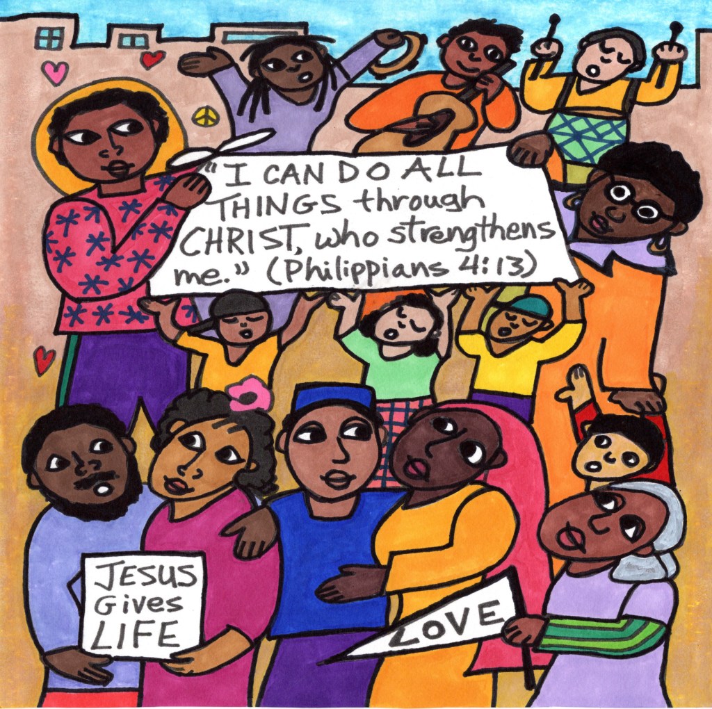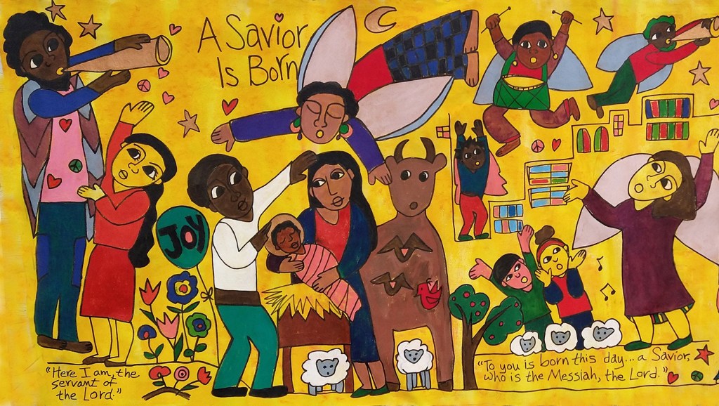This is photo two of the large “Nativity of Jesus” outdoor sign designed by Anni and painted by participants in three recent art workshops at Plymouth Congregational United Church of Christ (Washington DC). It shows angels and shepherds celebrating the miraculous birth of Jesus, the Messiah, the Savior, and the Lord of Life, who came to embody love for all, teach about the kingdom of God, and lead folks in the pursuit of justice and peace. May we keep him always uppermost in mind as the reason for this season and for every season, as the true light of the world. Wishing you and yours love, justice, peace, and all God’s many blessings!! Merry Christmas!! Anni ❤️💜